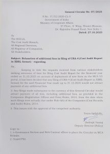 To ease the compliance burden on companies, the Ministry of Corporate Affairs (MCA) has issued an important circular announcing the extension of the deadline for filing the Cost Audit Report, i.e., CRA-4, for the financial year ending March 31, 2025.